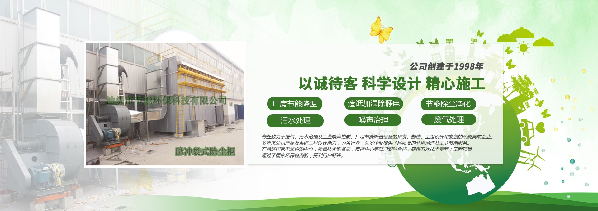 汕頭市節(jié)能環(huán)保科技有限公司創(chuàng)建于1998年,是一家專業(yè)致力于廢氣、污水、粉塵、噪聲治理,廠房節(jié)能降溫設(shè)備的研發(fā)、制造、工程設(shè)計(jì)和安裝的系統(tǒng)集成企業(yè)。多年來公司產(chǎn)品及系統(tǒng)工程設(shè)計(jì)能力,為各行業(yè),眾多企業(yè)提供了品質(zhì)高的環(huán)境治理及工業(yè)節(jié)能服務(wù)。產(chǎn)品經(jīng)國家電器檢測中心,質(zhì)量技術(shù)監(jiān)督局,疾控中心等部門測驗(yàn)合格,獲得五次技術(shù)專利;工程項(xiàng)目通過了國家環(huán)保檢驗(yàn)檢測,受到用戶好評。
